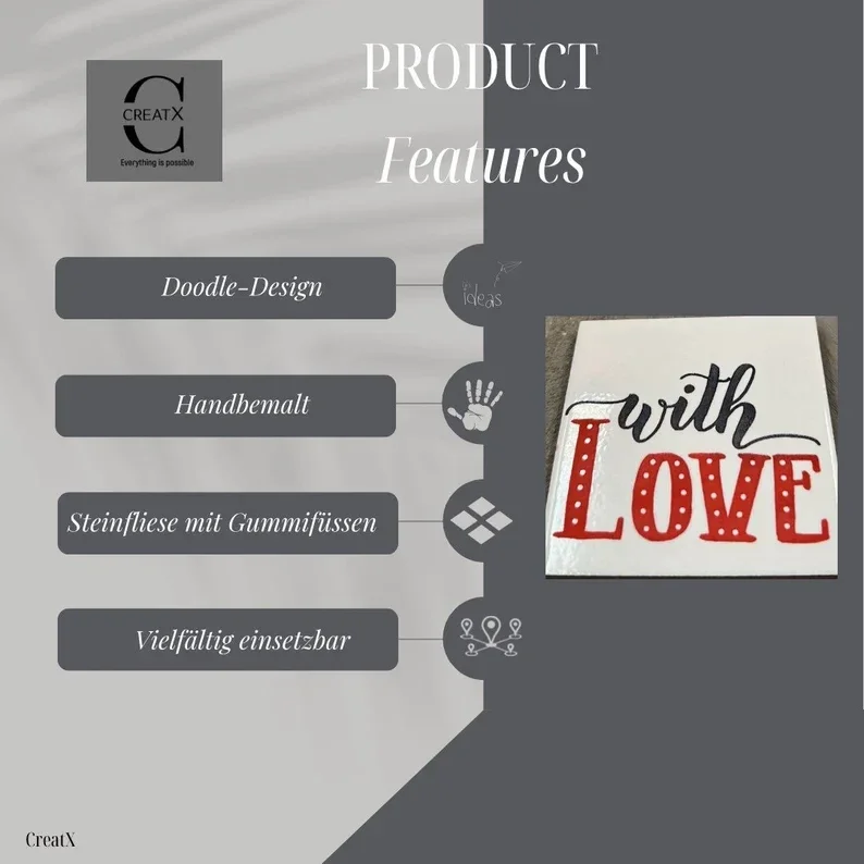 Ob als Untersetzer, der Euren Tisch in einem einzigartigen Style erstrahlen lässt und gleichzeitig vor Flecken schützt oder als Eyecatcher an Eurer Wand oder auf Eurem Regal. Als Geschenk oder für dein eigenes Zuhause - die Designuntersetzer von CreatX machen immer eine gute Figur.
