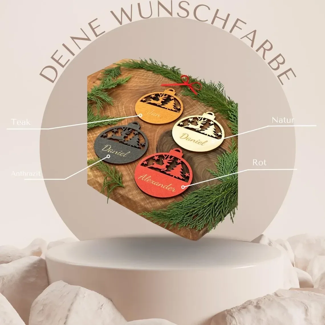 Erleben Sie einen besonderen Weihnachtslook mit unseren personalisierten einzigartigen Adventskugeln aus Holz. Jede Kugel wurde mit Liebe und Sorgfalt hergestellt, um eine festliche Atmosphäre zu verbreiten. Die kunstvollen Details und die Vielfalt an Mustern machen diese Kugeln zu einem Blickfang in jedem Raum.