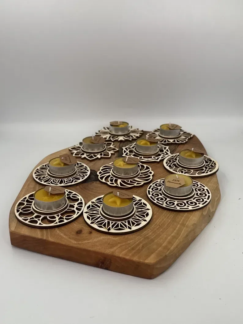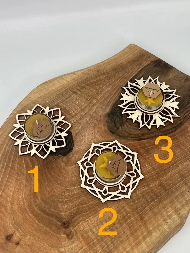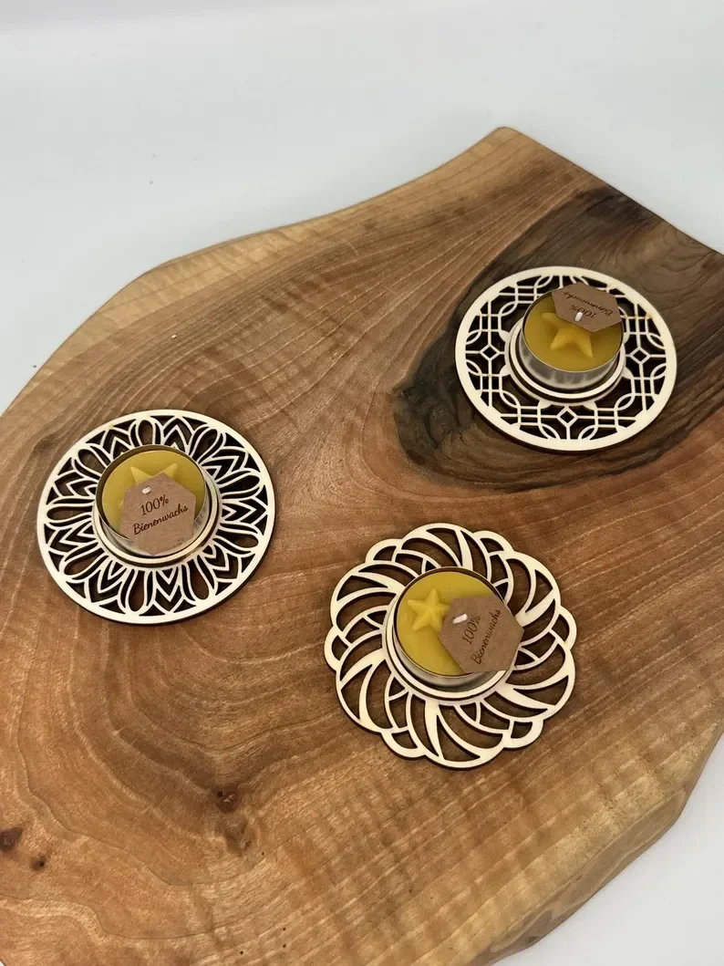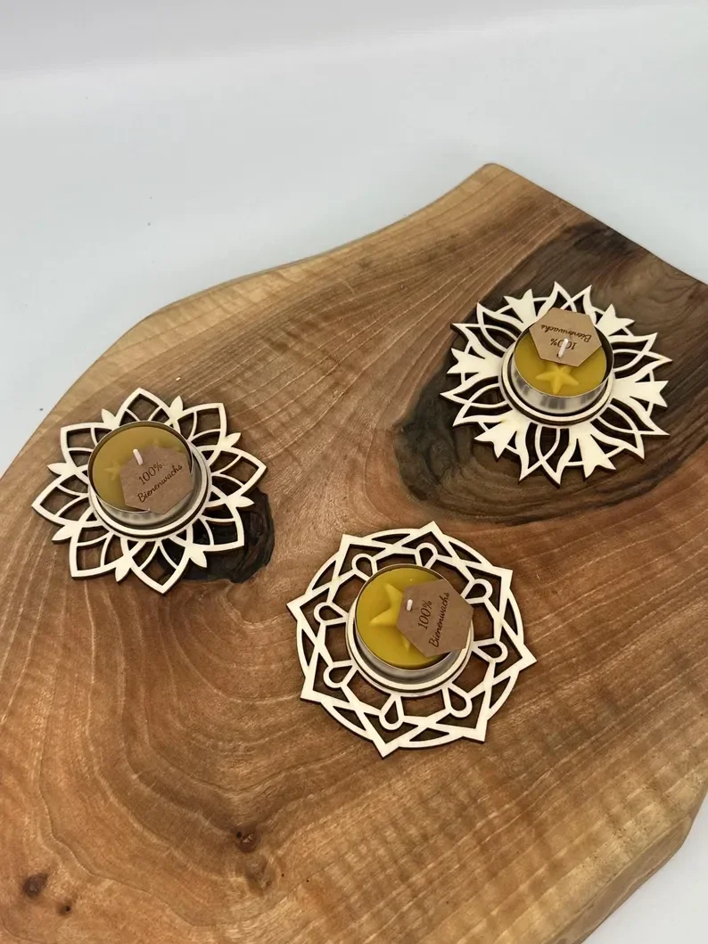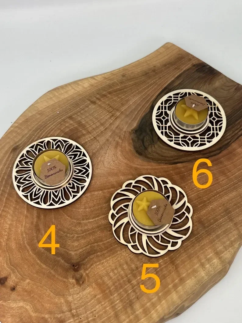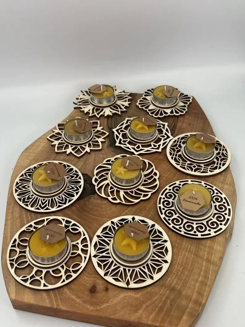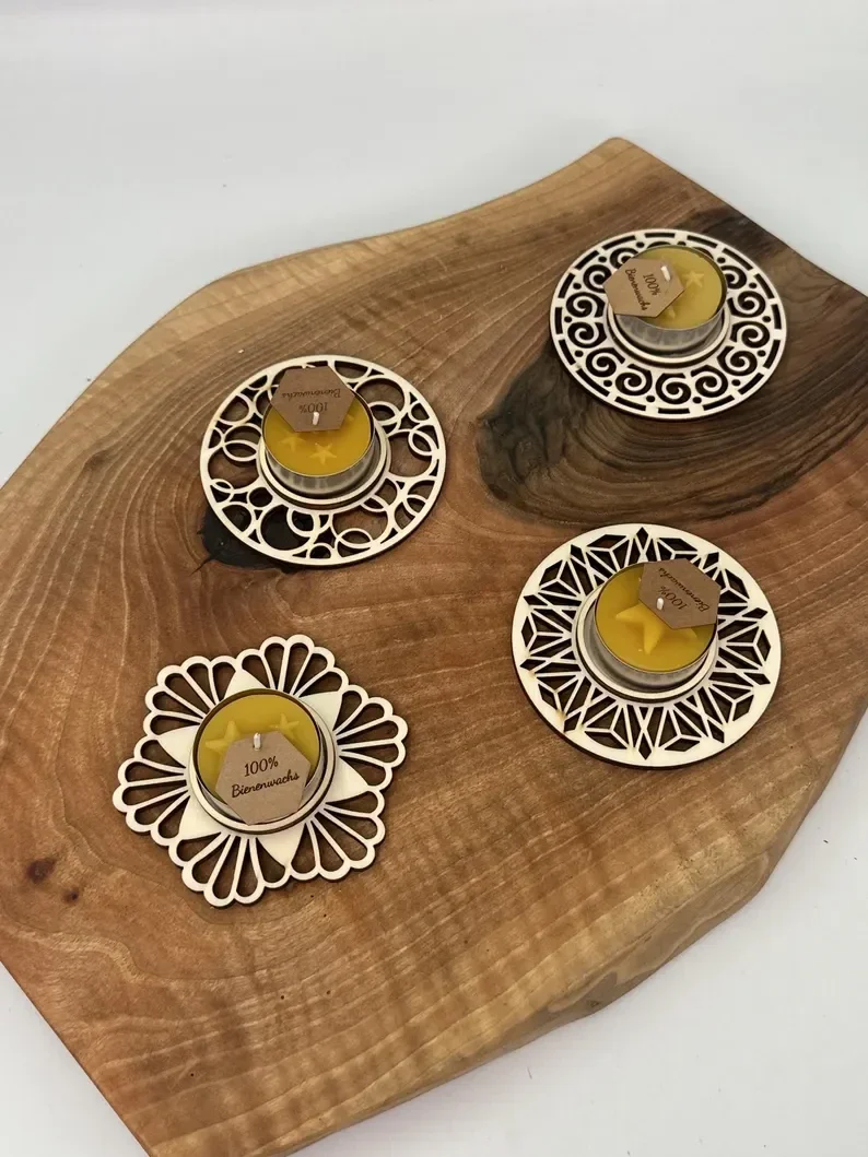 Der Teelichthalter aus Holz hat eine Stärke von 4mm. Er hat einen Durchmesser von ca. 10 cm.